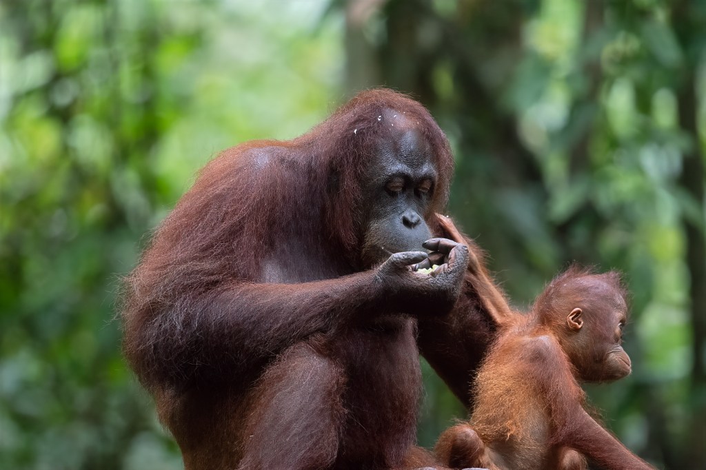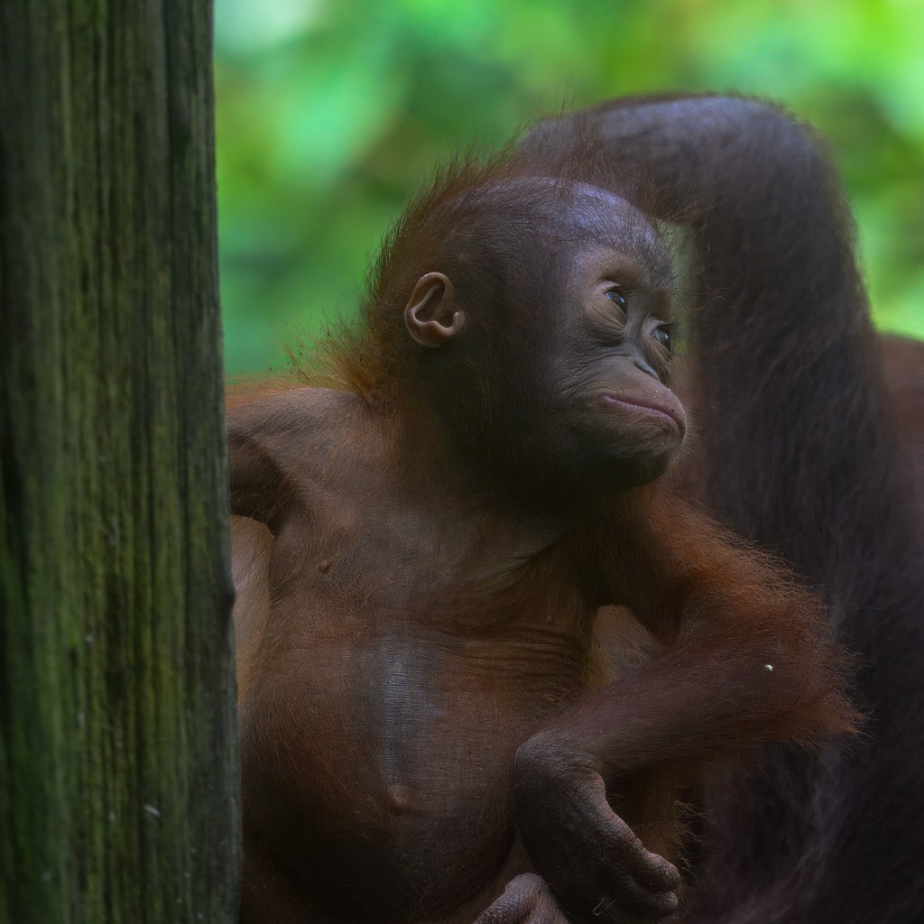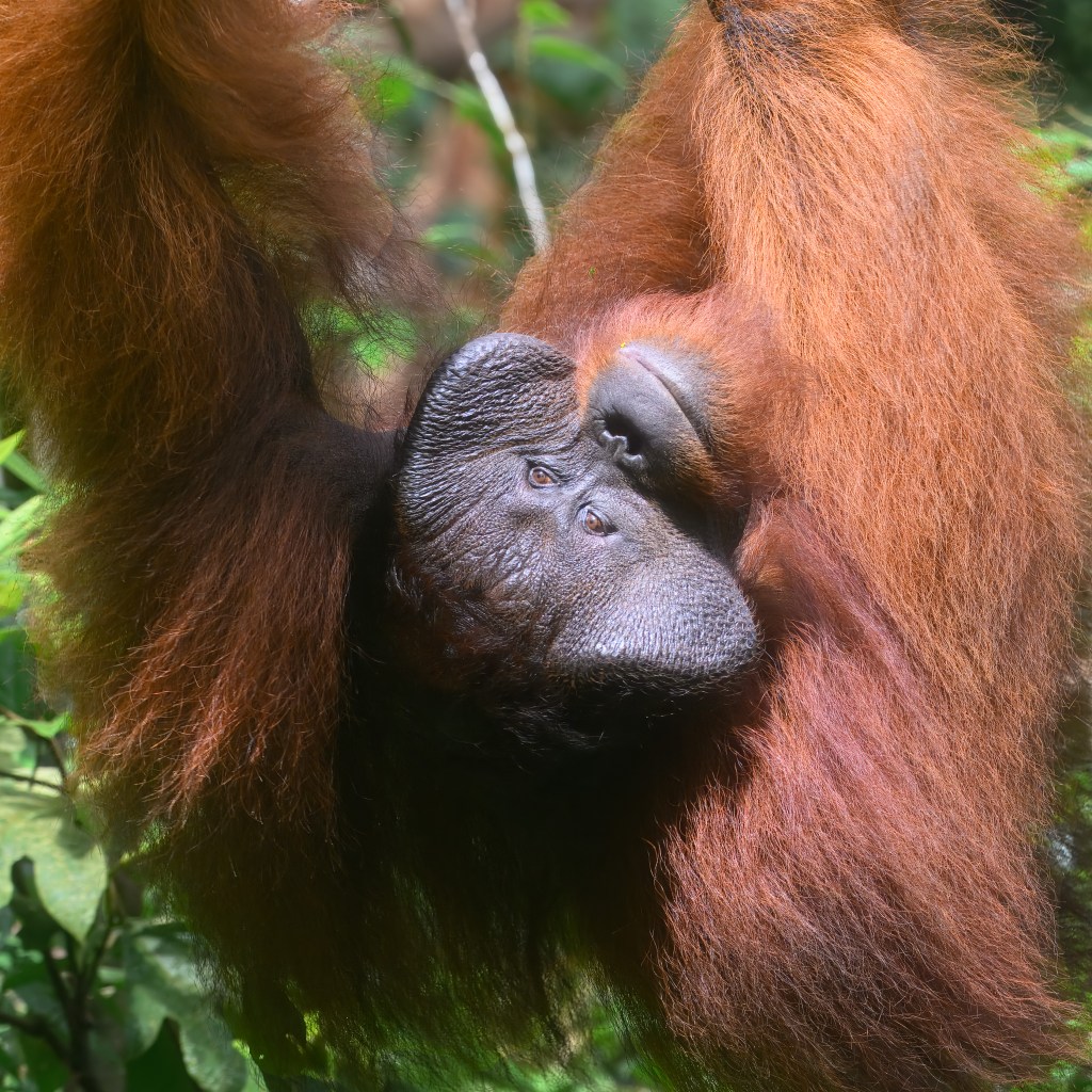The orangutans in this region belong to the Bornean orangutan species (Pongo pygmaeus), which is split into three subspecies across the island. They are critically endangered due to habitat loss, palm oil expansion, and fragmentation of the forest. Males grow large cheek pads as they mature, and you can hear their long call carry across the forest from far away, which is often the first sign they are nearby. Females have much smaller home ranges and usually travel with a single infant or juvenile.